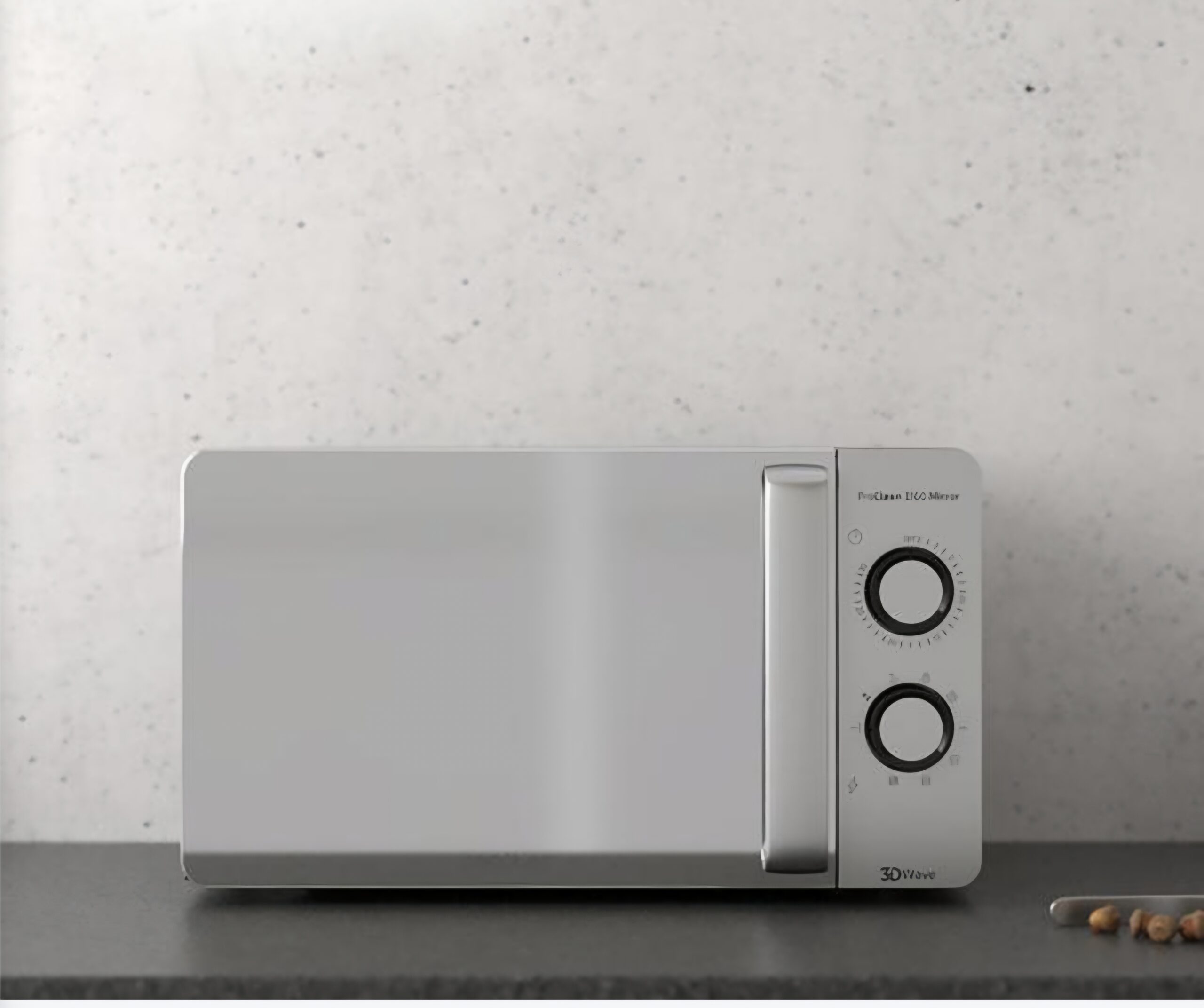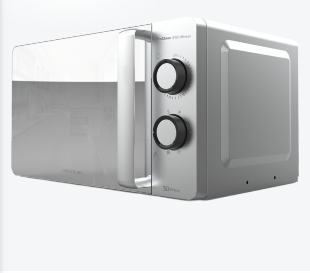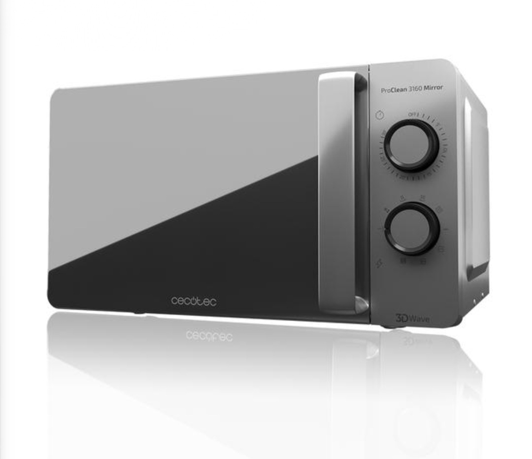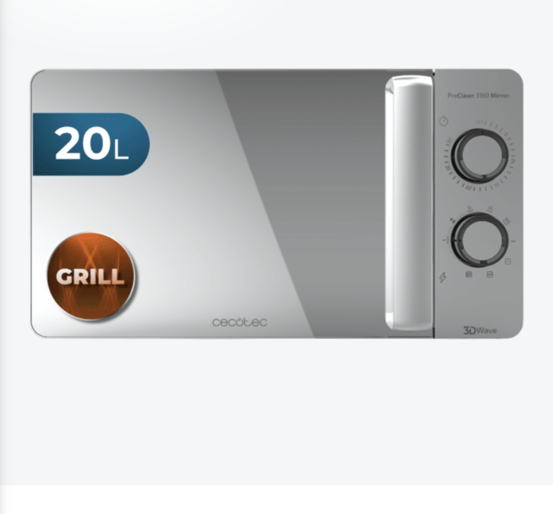 Microondas plateado con Grill y revestimiento Ready2Clean para una mejor limpieza, tecnología 3DWave, input 1150 W, output 700 W y Grill 800 W, 20 l. Diseño elegante con puerta de espejo, 6 niveles, ProClean 3160 Mirror de Cecotec.